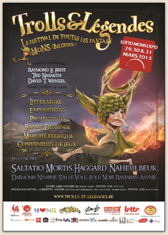 Comme tous les deux ans va avoir lieu à Mons, en Belgique, le festival "de toutes les fantasy" :Trolls et légendes. Au programme, musique, cinéma, jeux, contes, dédicaces d'illustrateurs et d'auteurs dont les univers touchent à la fantasy, au fantastique ou au steampunk.