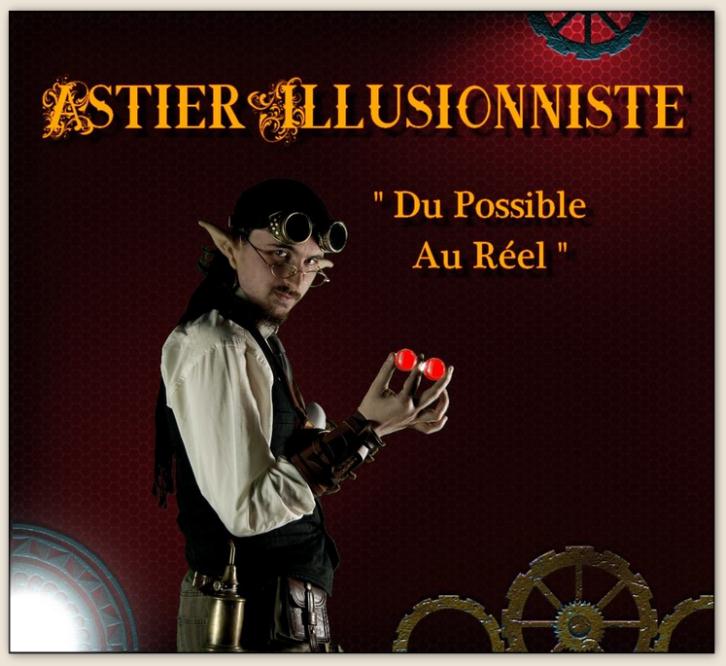 |  Astier l'illusionniste |  Astier Ouroboros est illusionniste. Ses spectacles très participatifs sont toujours dans un univers steampunk. Son personnage est un gnome qui convie le public a des conférence scientifiques et des expériences participatives où il le met à contribution. Il lit dans les pensées, fait des prédictions, tord des objets.... Son spectacle, l'automate, nous entraine pendant 50 minutes, sur une musique de Spiky.