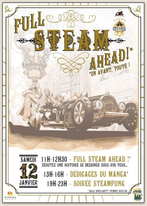 Samedi 11h-12h30 : "Full Steam Ahead!" une histoire contée et dessinée en direct par les auteurs de City Hall : Rémi Guerin (scénario) et Guillaume Lapeyre (dessin) 13h-16h : Séance de dédicace par les auteurs 19h-23h : Soirée "saveur Steampunk" au Dernier Bar